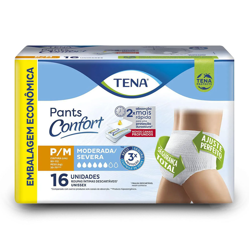 Tena Pants Confort é uma roupa íntima descartável, unissex, desenvolvida com tecnologia avançada para oferecer conforto e segurança a pessoas ativas que lidam com incontinência urinária. Com 16 unidades por embalagem, esse produto é ideal para quem busca proteção discreta e eficaz contra vazamentos.